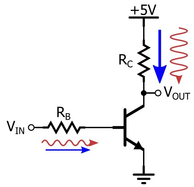 The straight blue arrows represent the large-signal portion of the base and collector current, and the sinusoidal red arrows represent the small-signal portion.