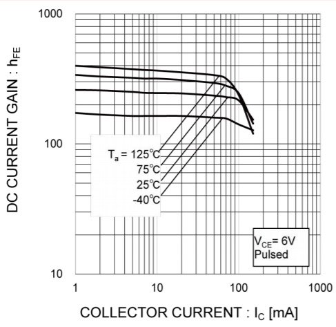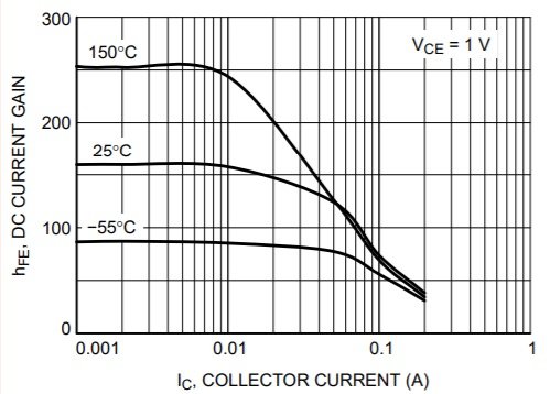 All of the hFE vs. IC plots have different curves for different temperatures. This tells us that beta is influenced not only by collector current but also by temperature.