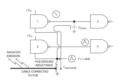 The ground bounce can lead to a noise voltage at the output of gate 2 and, if large enough, even cause an unwanted transition at the output of gate 4. This is only one example illustrating the importance of rise time in a high-speed digital design. We discussed in a previous article that a sufficiently small rise time can lead to the wave reflection phenomenon when driving a relatively long wire with a fast logic gate.