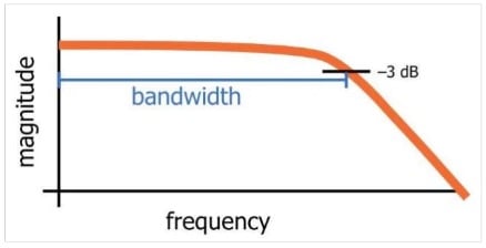 Bandwidth is a common frequency domain parameter used to describe the behavior of a circuit. For example, we usually consider a 3-dB bandwidth to describe the frequency response of a filter or communication channel. As shown in Figure 2, the 3dB bandwidth of a low-pass filter is part of the frequency response that lies within 3 dB of the transfer function magnitude at DC (in this figure, the magnitude at DC is 0 dB and it drops to -3 dB at the far end of the transfer function bandwidth).