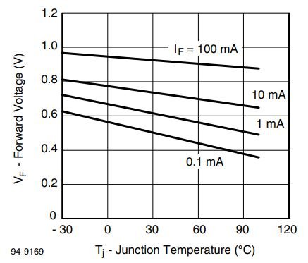 If you’ve ever spent a Saturday afternoon browsing through the plots and performance curves in a diode datasheet, you’ve perhaps noticed an interesting detail: a standard silicon diode has a pleasantly linear relationship between forward voltage and temperature. For example, the following plot is taken from the datasheet for a 1N4148 diode made by Vishay: