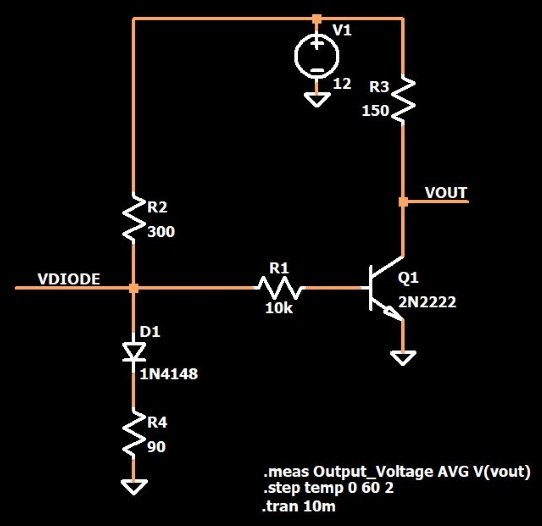 Toward the end of my experimentation I realized something that is probably responsible for a large portion of the confusion that I experienced: my simulation changes the temperature of the entire circuit, whereas I was thinking only about the diode’s response to temperature changes. There are pn junctions in the BJT as well! If the diode is affected by temperature, so is the BJT. However, my goal was to design a circuit that could be used as a self-contained temperature sensor, not something where the diode is separated from the rest of the circuit, which means that my simulations are consistent with the objective.