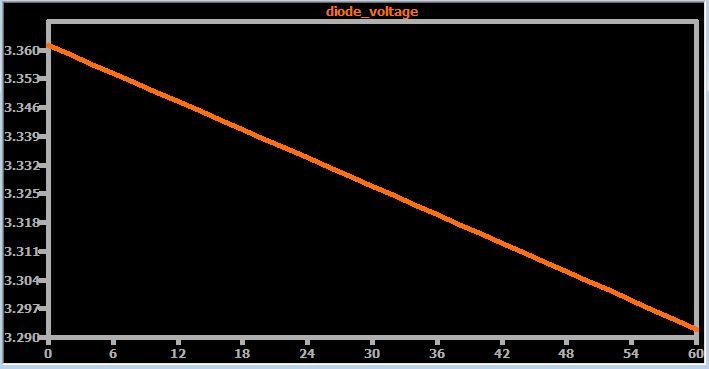 We know that a diode will produce voltage variations in response to changes in ambient temperature. If that were enough, we wouldn’t bother with the BJT circuit. The goal here is a circuit that amplifies the diode’s voltage variations and thereby produces a thermometer signal that is more capable of directly driving an indicator of some kind. So first let’s look at a plot of diode voltage vs. temperature.