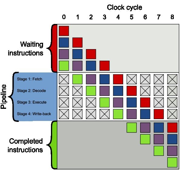 Figure 1. A visual representation of a pipelined processor architecture. Each square corresponds to an instruction. The use of different colors for the squares conveys the fact that the instructions are independent of one another. Image courtesy of Colin M.L. Burnett [CC-BY-SA-3.0].