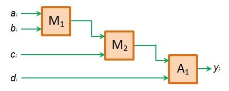 Here, we expect the sequence of operations to be the multiplication of ai and bi data by multiplier M1, followed by the multiplication of its product with ci by multiplier M2 and finally the addition of the resultant product with di by adder A1.