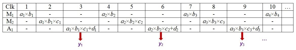 When the clock ticks for the third time, there would be valid inputs at all the three components: M1, M2, and A1. Nevertheless, we only want the adder to be operative as we would expect the output to be y1 = (a1 × b1 × c1 + d1). This means the first output of the system will be available after the third clock tick.