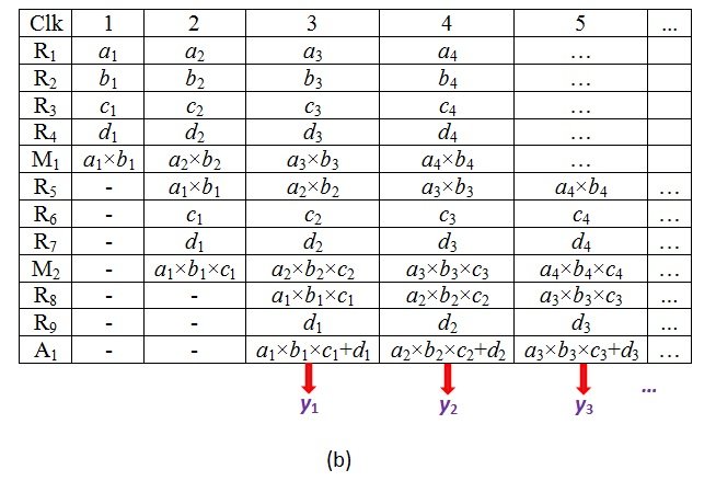 Next, when the clock ticks for the third time, the outputs of registers R8 and R9 ((a1 × b1 × c1) and d1) are passed as inputs to adder A1. As a result, we get our first output y1 = ((a1 × b1 × c1) + d1). Nevertheless, at the same clock tick, M1 and M2 will be free to operate on (a3, b3) and (a2, b2, c2), respectively. This is feasible due to the presence of registers R5 isolating block M1 from M2 and R8 isolating multiplier M2 from adder A1.