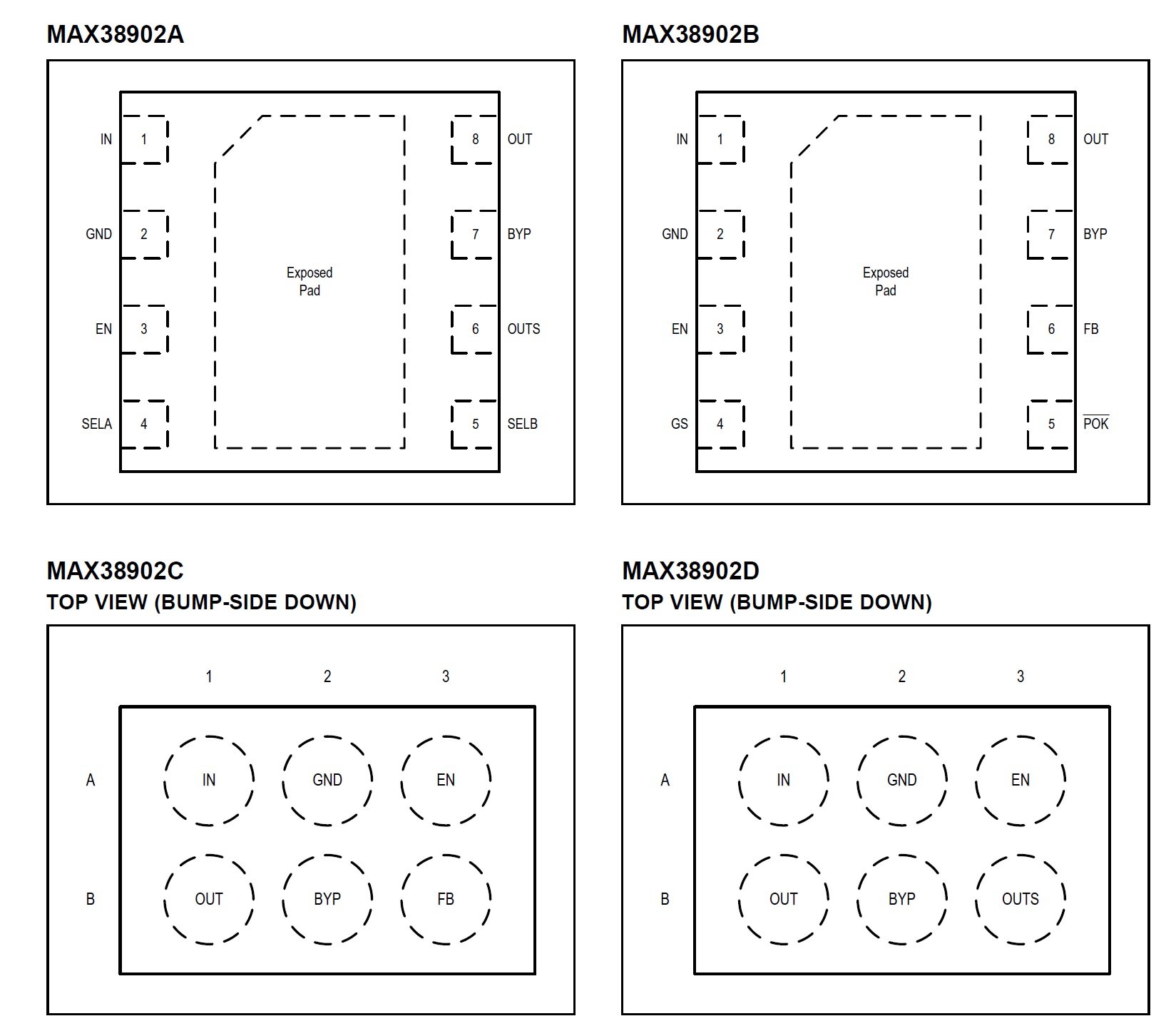 Two of the devices from this series, namely the MAX38902A and MAX38902B, are available in a 2 × 2mm, 8-pin TDFN, or thin DFN, package. The other two devices—the MAX38902C and MAX38902D—come in a much smaller package, specifically a 2 × 3 bump, 1.22 × 0.82mm, 0.4mm pitch wafer-level package (WLP).