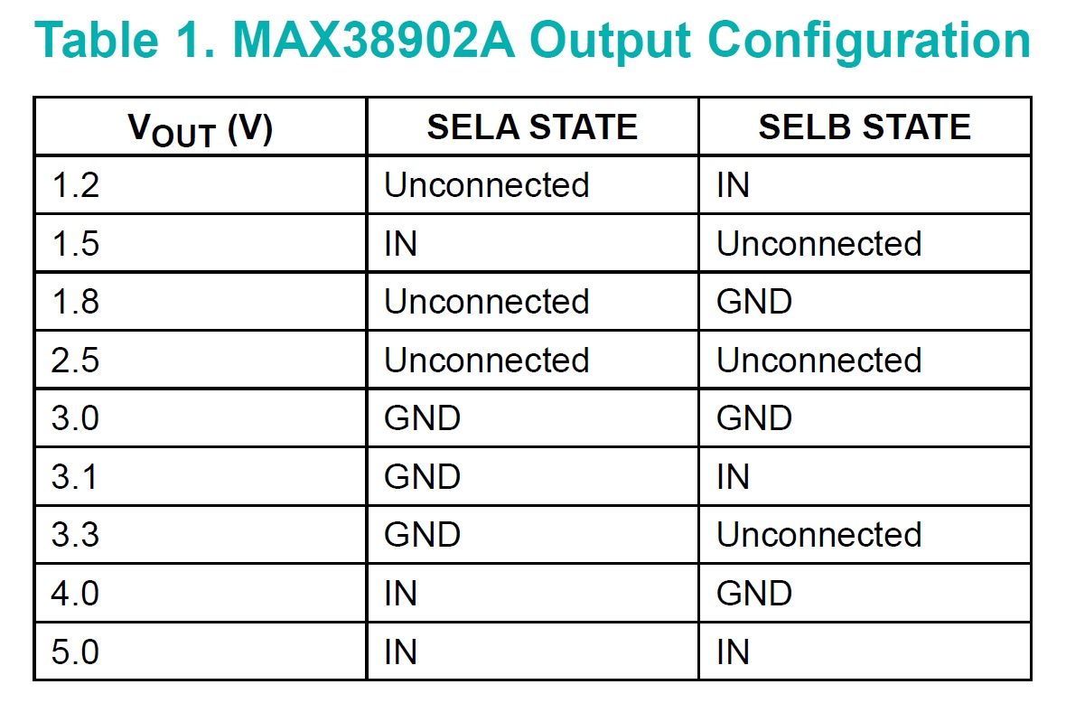 Figure 2. MAX38902A VOUT is set by use of the SELA and SELB pins. Table taken from the datasheet (PDF).