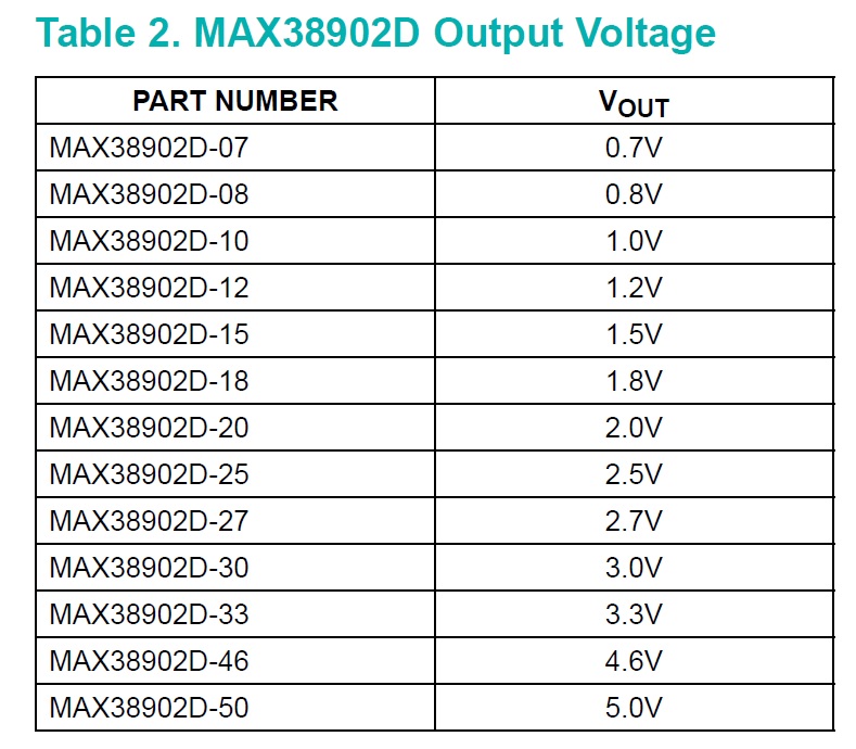 Figure 4. MAX38902D standard VOUT options, from the datasheet (PDF).