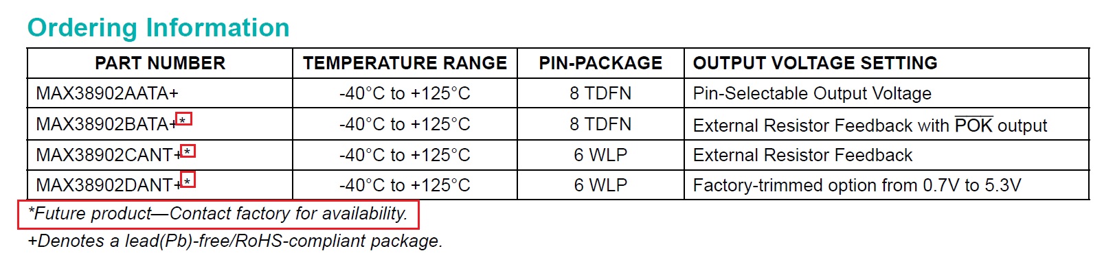 Setting the output voltage of the MAX38902D is the easiest since you don’t really have to set it at all. The device comes pre-programmed according to the part number (see table below). The table shows the "standard" VOUT values, and any voltage between 0.7V and 5.3V, in 50mV steps, is available by special order.