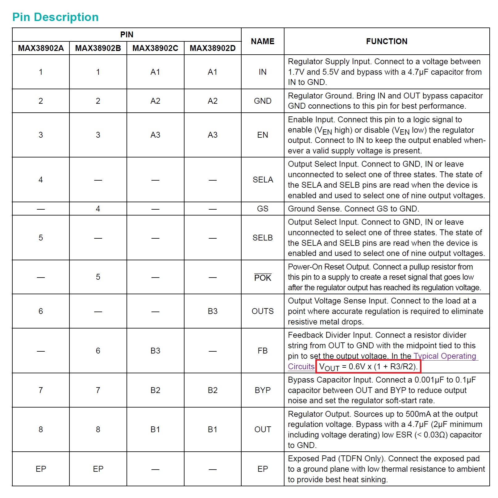 Apart from the package type, the primary difference between the various members of the MAX38902 family is the manner in which VOUT is set.