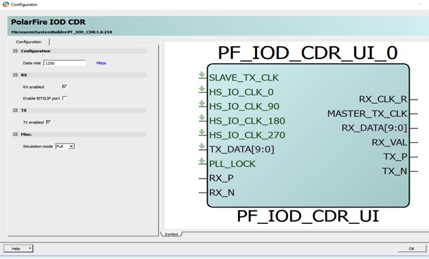 In the first example, system-on-chip (SoC) FPGA design software tools are used to implementing the interface functionality over GPIOs. The FPGA’s Ethernet interface IP includes a core that combines a GPIO and CDR that is available in every GPIO bank lane of the device to provide clock and data recovery for 1 GbE data transfer rates. Each side of the device can have more than one of these cores sharing high-speed signals from a phase-locked loop (PLL) located at the corner of the FPGA fabric. The GPIO core is instantiated from the software suite’s catalog and then configured by selecting the data rate (in this case, 1250 Mbps). It is combined with a PLL core and MAC transmit and receive logic to complete the design. The snapshot of the GPIO core is shown in the diagram below.