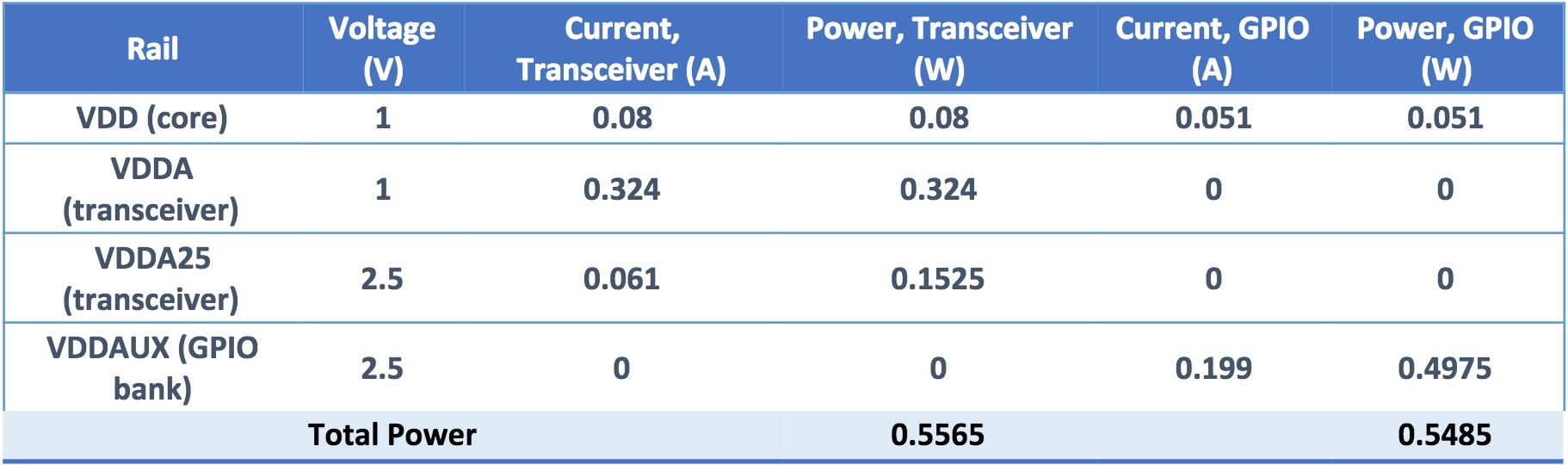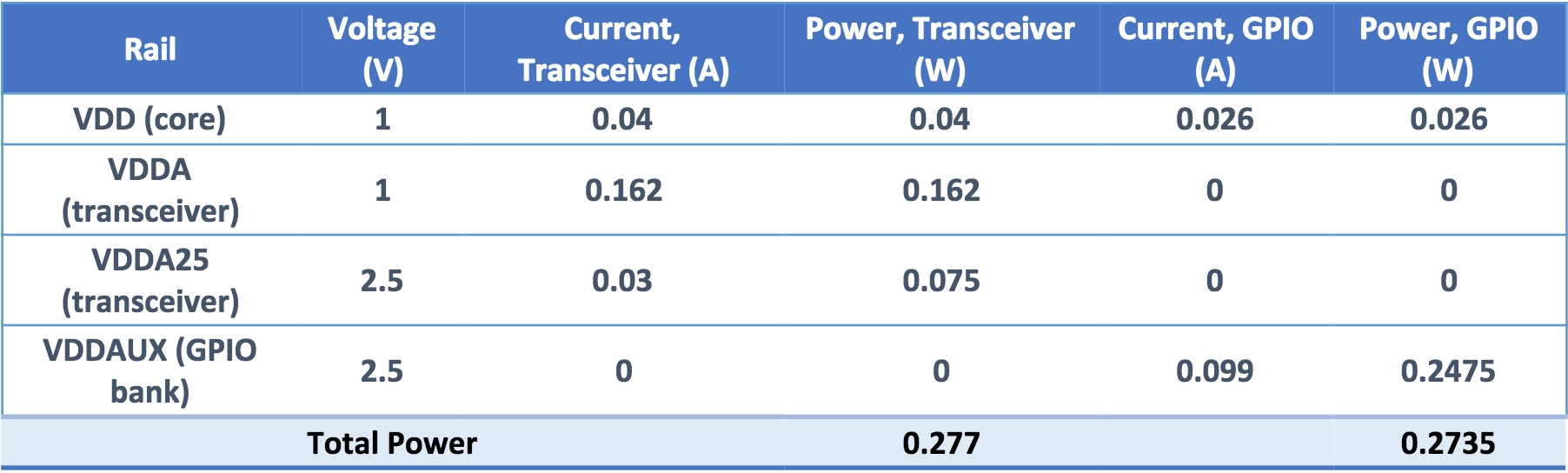 The following tables list the total power consumed by different rails for a single lane of GPIO or single lane of transceiver, eight lanes of GPIO or eight lanes of transceiver, and 16 lanes of GPIO or sixteen lanes of transceiver.