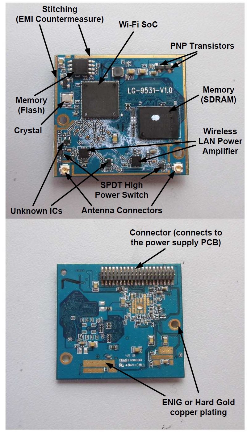 The third PCB, which connects to one of the other PCBs using a board-to-board connector, contains the Wi-Fi circuitry.