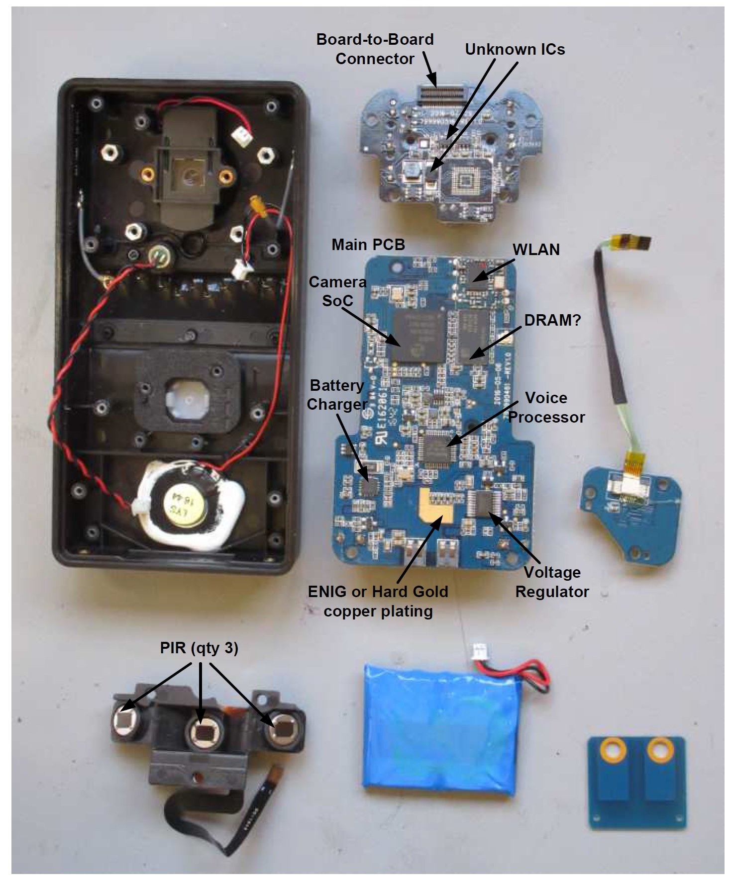 Approximately fifteen additional screws hold all the internal components securely in place. As mentioned before, this enclosure contains many electrical subassemblies, including a rechargeable battery, flex circuits, PIR sensors, a speaker, a microphone, antennas, wires, a camera (of course), and multiple PCBs, all of which are neatly and professionally organized.