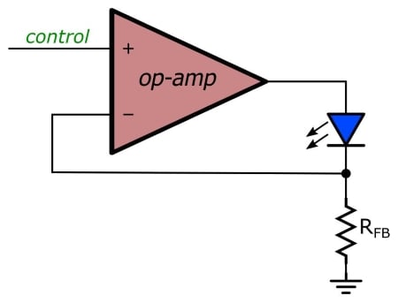 We know from the “virtual short” approximation that an op-amp’s two input terminals will be at the same voltage. This means that the voltage at the upper terminal of R1 is equal to the control voltage, and thus the current through R1 is always VCONTROL/R1. But what is the source of this current? It certainly can’t be sourced by U1’s inverting input terminal, and the only other possibility is U1’s output terminal. Thus, the current flowing from U1’s output is always VCONTROL/R1, and consequently the current through the diode is always VCONTROL/R1. The same would apply if the diode were replaced by a resistor, or even an inductor. In other words, this circuit is used to precisely control the current flowing through the component that is placed in U1’s feedback path.