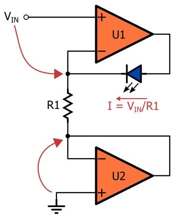 The article has presented and explained a simple yet effective circuit for using a voltage signal to precisely control the current through a load component. This configuration is more versatile than a circuit that I used previously because it accepts differential input voltages. However, remember that not every op-amp has rail-to-rail inputs; if the negative supply is at 0 V, some op-amps will not be compatible with the grounded-input version of the VCC discussed in this article.