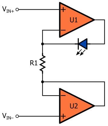 The primary difference between this circuit and the one-op-amp-circuit used in the single-pixel-color-display project is the following: the two-op-amp circuit is differential, whereas the one-op-amp circuit is single-ended. In the one-op-amp circuit, the input is always referenced to ground. The dual-op-amp configuration allows you to control the load current using a differential voltage; this is depicted in the following circuit diagram, where U2’s noninverting terminal has become a second input rather than a direct connection to ground.