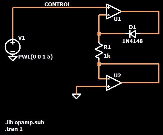 Let’s consider the functionality before we look at the simulation plots. The circuit consists more or less of two interconnected voltage followers; I say “more or less” because one of the followers has a diode in the feedback path. The follower on the bottom has ground as its input voltage, so the output voltage, and therefore also the voltage at the inverting input terminal, is 0 V. This means that the lower terminal of R1 will always be at 0 V.