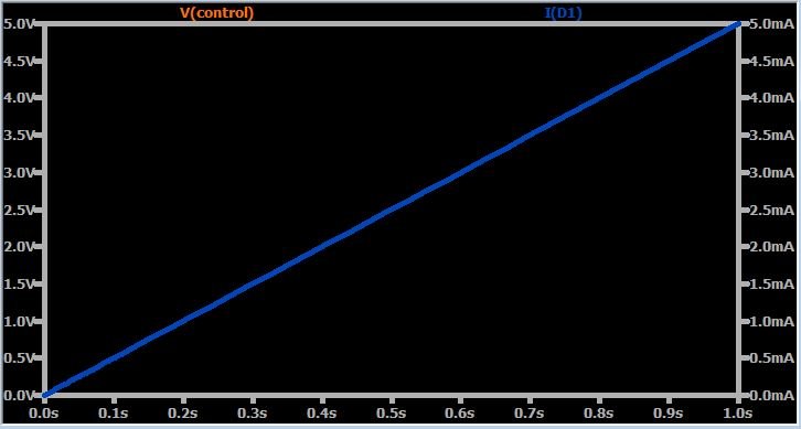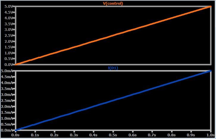 Here’s the LTspice implementation, followed by two plots. In the first, you can see only one trace because the two traces (input voltage and load current) are perfectly overlapping. In the second plot I put the two traces in separate panes. These plots confirm that the load current carefully follows the input voltage, despite the diode’s complicated current–voltage characteristics, and that the relationship between input voltage and load current is indeed the (pleasantly simple) equation explained above, i.e., IL = VIN/R1.