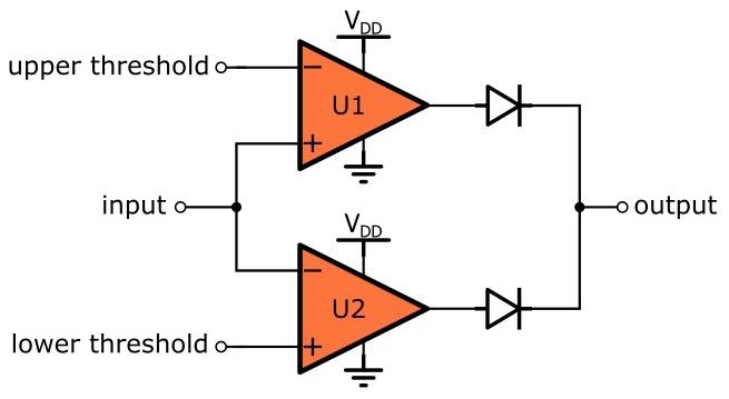 “Out-of-window” implementations are less common, and I’m having a bit of trouble thinking of a good example. Ordered systems—biological systems, chemical systems, mechanical systems, etc.—are typically sensitive to extremes rather than to parameters that fall into a limited range. One possibility is discrimination, i.e., eliminating irrelevant data because it clearly is not produced by something that the system is concerned about. I’m thinking here of something like a scale that only needs to analyze the weight of certain types of objects. If the measured weight is outside of the specified window, the object is assumed to be irrelevant and no further analysis is performed. Another idea is a system that must attenuate a variable-frequency signal if it approaches a certain frequency. Maybe this frequency is present elsewhere in the system and must be protected from any kind of interference. A frequency-to-voltage converter in conjunction with a window detector could be used to alert the system whenever the signal’s frequency is not outside of the specified window.