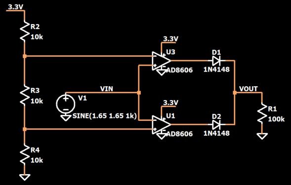 There is certainly nothing wrong with this approach, especially if you already have a microcontroller in the design. But the endless drive to reduce size, cost, and power consumption requires engineers to be flexible and to consider new (or old) ways of meeting system requirements. Window detection can be easily accomplished with two op-amps, a few passives, and two diodes. This is a compact, inexpensive implementation that could come in handy in designs that 1) don’t need a microcontroller or 2) have a bare-bones microcontroller that lacks the necessary functionality.