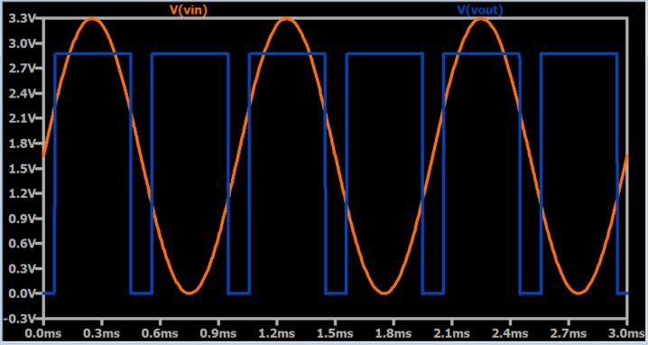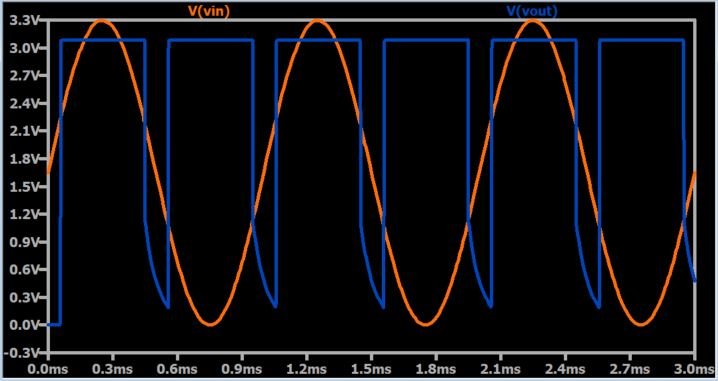 As expected, the output is logic low only when the input voltage is between the two thresholds.