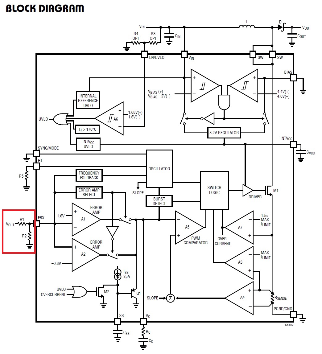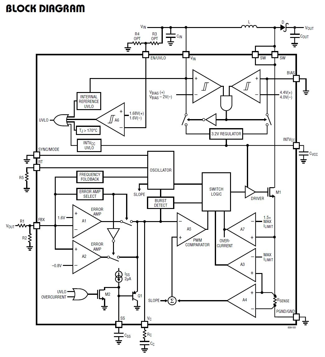 Figure 1. The LT8364 offers versatility, but with this comes some additional design effort. Here is the internal block diagram along with external components, taken from the datasheet (PDF).