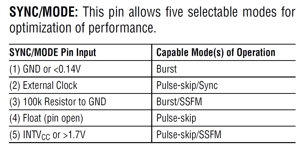 Only in sleep mode does the LT8364 consume 9µA of quiescent current. Sleep mode is achieved by configuring the SYNC/MODE pin to Burst Mode, which is done by pulling the SYNC/MODE pin to GND (or <0.14V). See the figure below for SYNC/MODE configuration options.
