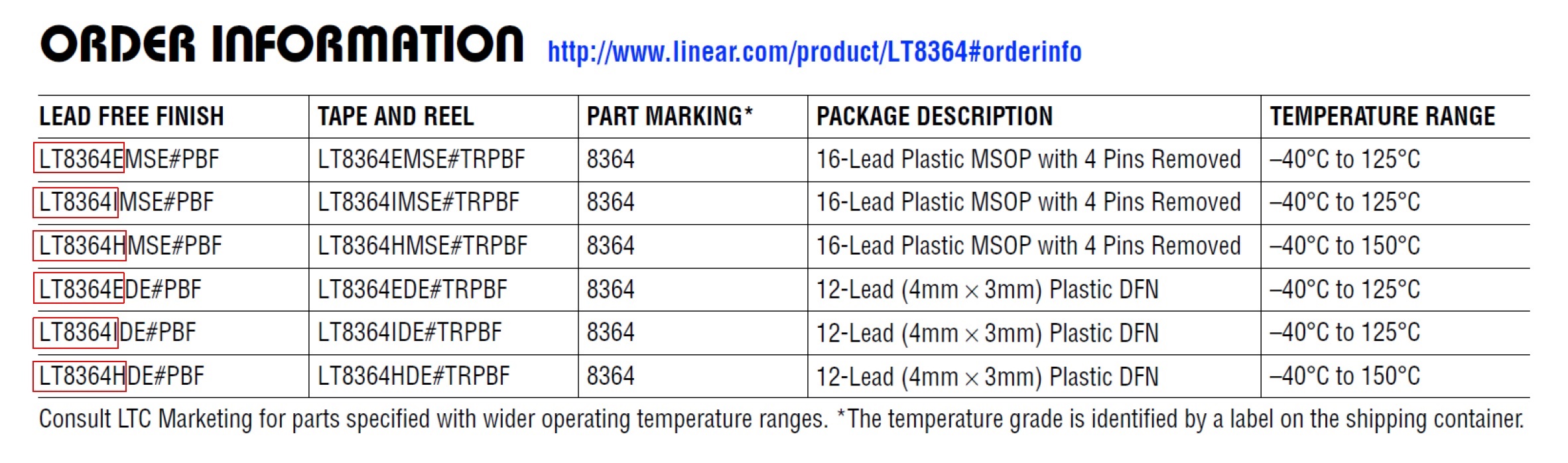While this device is clearly stated to have two temperature range part number options, specifically -40°C to 125°C and -40°C to 150°C (see the Temperature Range column in the figure below), this device is actually available in three variants—six variants when considering the two package types—namely LT8364E, LT8364I, and LT8364H.