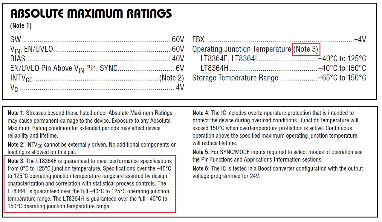 This guaranteed information is also clearly stated in the datasheet...as long as you read Note 3 on page 4. And, as can been seen in the figure below, Linear Tech does not attempt to hide this fact but, on the contrary, brings attention to it by calling out "Note 3" in the section entitled Absolute Maximum Ratings. See the figures below.