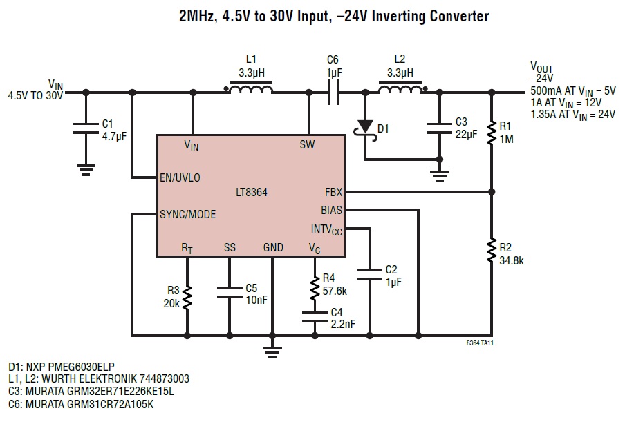 As an example, the application circuit below shows recommended parts for D1, L1, L2, C3, and C6 as used in a circuit for generating an output voltage of -24V from an input voltage ranging from 4.5V to 30V, with the converter switching frequency set to 2 MHz.