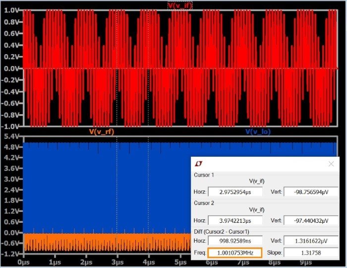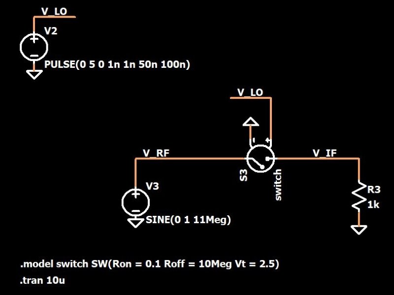 Let’s imagine that this mixer is shifting the received RF signal down to the intermediate frequency (IF). The received signal is at 11 MHz, and the LO is a 10 MHz square wave. The multiplication is implemented by means of a voltage-controlled switch connected to the LO signal. The frequency of the output signal should be equal to the input frequency minus the LO frequency, i.e., 1 MHz.