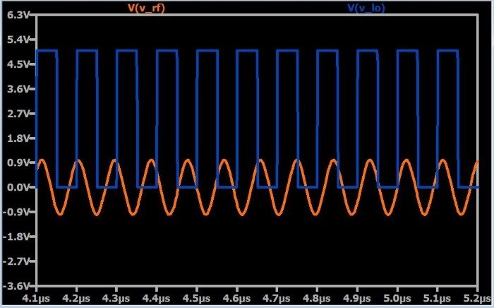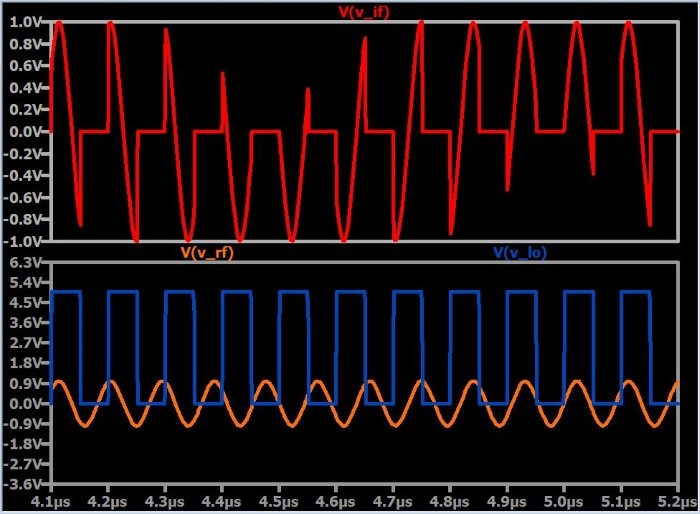 This is, indeed, nothing more than a voltage-controlled switch. The received RF signal is applied as the input voltage, and the LO controls the switch. So all we’re really doing here is turning the input signal on and off according to the frequency of the LO.