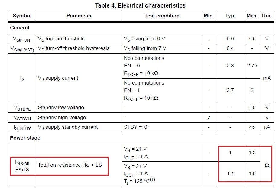 Figure 2. The STSPIN820’s "low" RDSon values, from the datasheet (PDF).