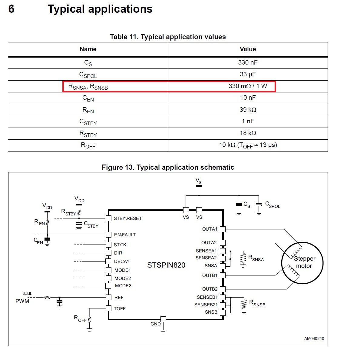As noted in the datasheet, this IC requires two external sense resistors (RSNSA and RSNSB), and because these resistors play an important role in the PWM current control—for both slow decay and mixed decay current recirculation conditions—their values must be chosen carefully. Fortunately, ST has provided values for these resistors in a typical application (see image below), and they suggest values for other external passive components. They also offer a trick for easily achieving lower resistor values with higher power ratings; this trick—though it's probably, hopefully, common knowledge for any electrical engineer—is simply placing multiple resistors in parallel. But hey, maybe ST thought that we might forget about this technique in this particular situation...so thanks, ST, for the reminder.