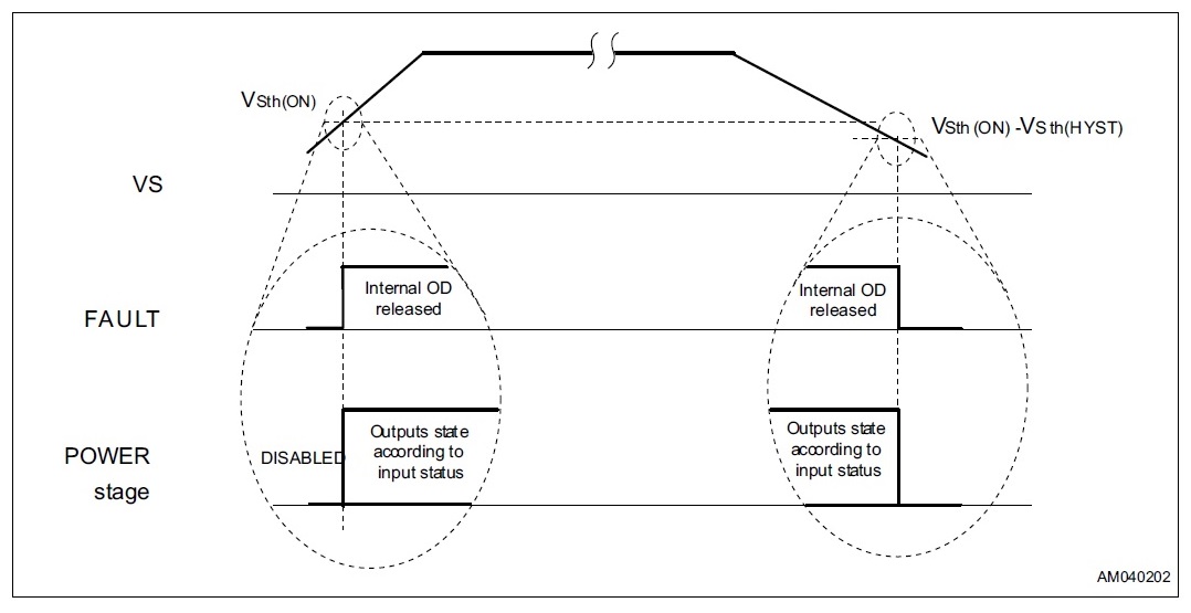 - Undervoltage lockout (UVLO): During power up, the power stage is disabled—and the Fault pin is forced low—until the voltage on the VS pin (actually, there are two VS pins and they must be at the same voltage) rises above the VS threshold voltage (VSth(ON)), which is 6.0 V (typical). The image below shows the undervoltage lockout protection scheme.