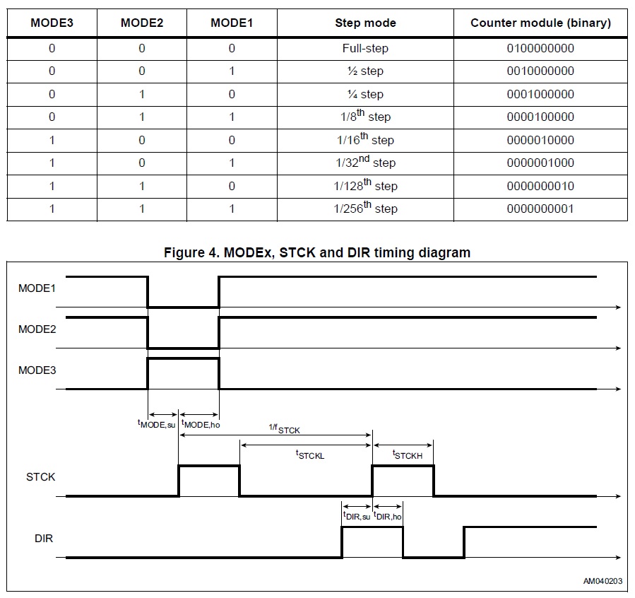 For this device, ST uses three Mode inputs for achieving a stepping range from full-step to 1/256th of a step. As shown in the image below, each of the three mode settings (MODE1, MODE2, and MODE3) are clocked in on the rising edge of STCK (step clock input). And to allow for a very quick stepper motor response, the three mode settings can be changed at any time, and these changes are applied immediately.