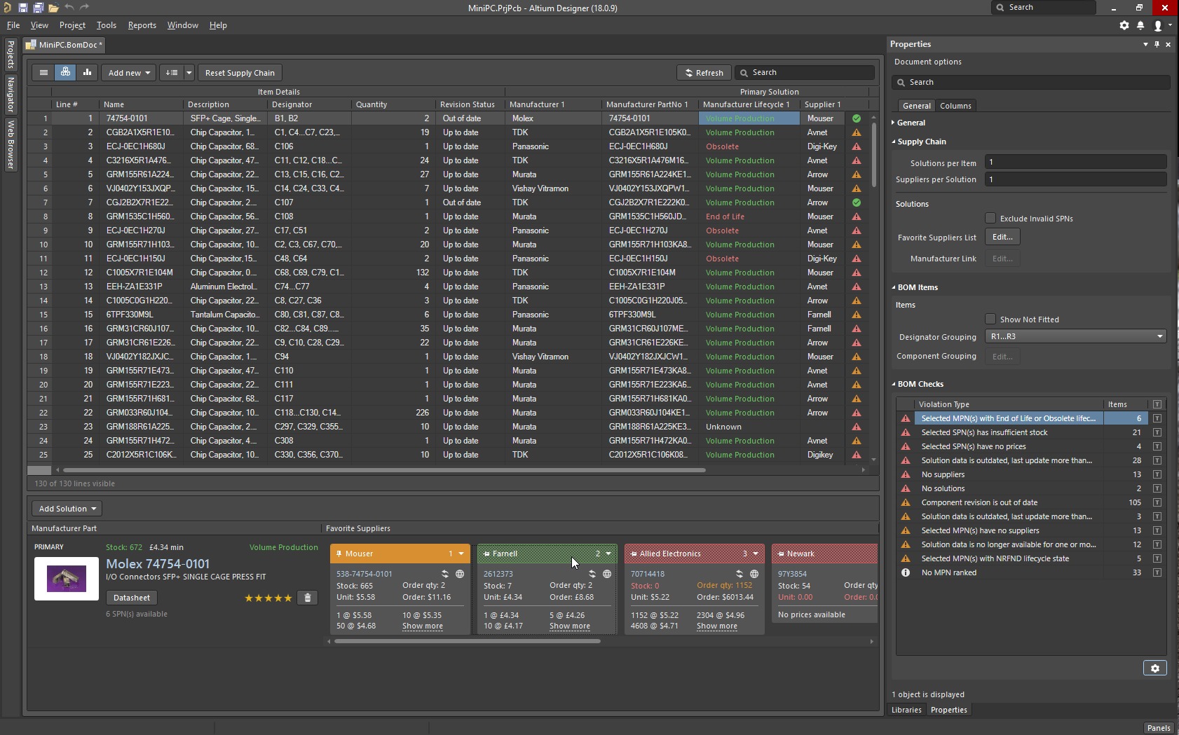 Finally, in one of the last steps of PCB design is the creation of the bill of materials. The ActiveBOM feature in Altium Designer 18 connects to information from vendors to provide real-time information on component availability and price so that information can be accessed throughout the design process before final decision making at the end.