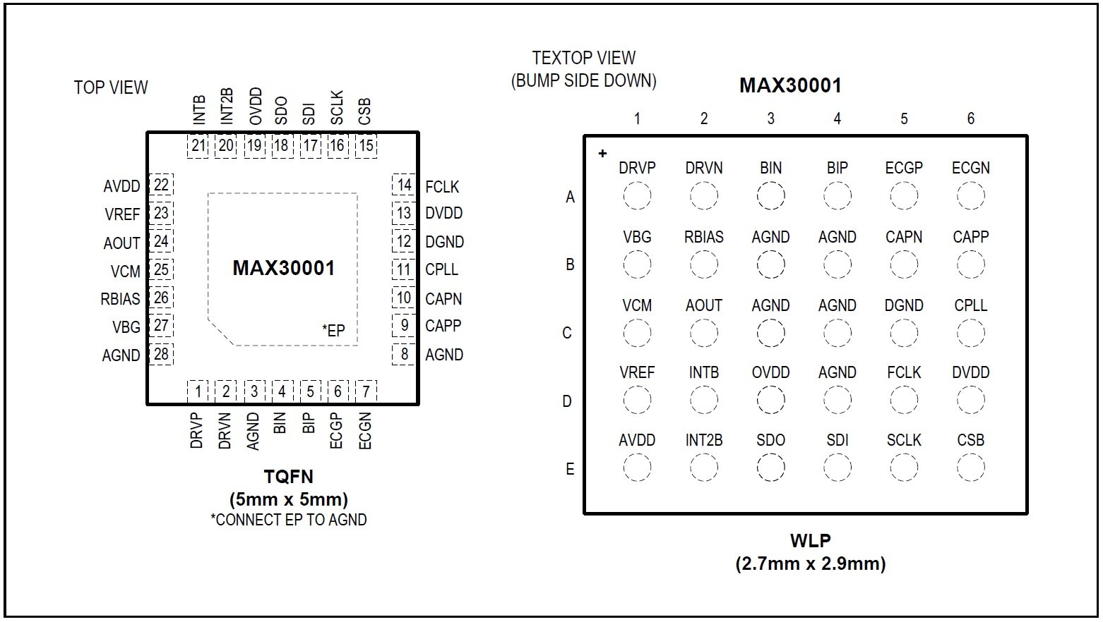 Depending on your design's requirements, when using the MAX30001 biosensor, you have two package types to choose from. One is a 28-pin 5mm × 5mm TQFN (thin quad flat no-leads) package; this package is better suited for those who might need to do some hand placement or manual soldering (such as with a hot-air gun), or those who simply don’t want to deal with a wafer-level package (WLP)... which is the other available packaging option. The 30-pin wafer-level package (2.7mm × 2.7mm) is meant for space-constrained applications. The image below show the pinouts and dimensions of these two package types.