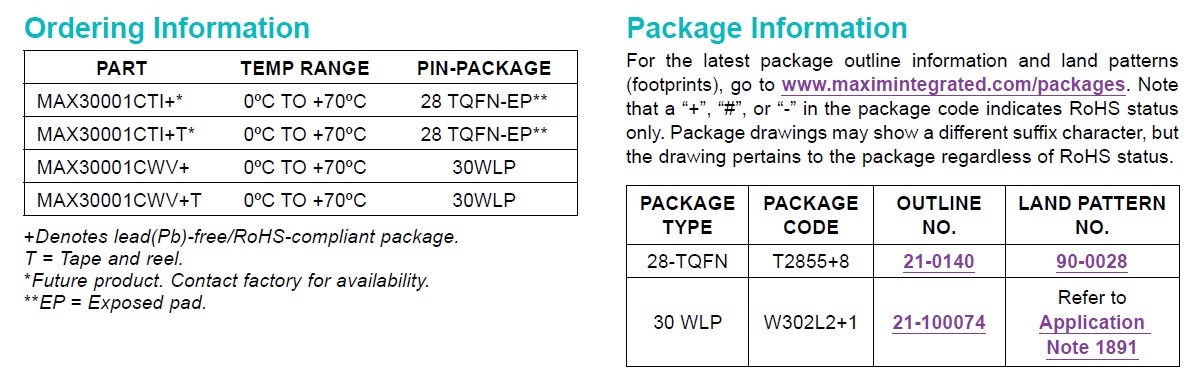 What, you might be asking, are biopotential and bioimpedance measurements? Well, according to the datasheet, the MAX30001's biopotential channel provides electrocardiogram (ECG) waveforms, senses heart rate, and can detect pacemaker edges, while the bioimpedance channel measures respiration. It all sounds like magic to me! Equally impressive is the IC's very-small package—actually, there are two package options.