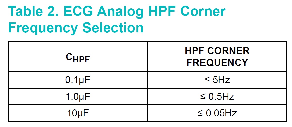 Table 2 of the datasheet (see image below) shows the recommended frequency-setting capacitor (CHPF) values. Furthermore, the Pin Description table suggests using X7R capacitors with high voltage ratings (25V) for improving the linearity of the ECG signal path.