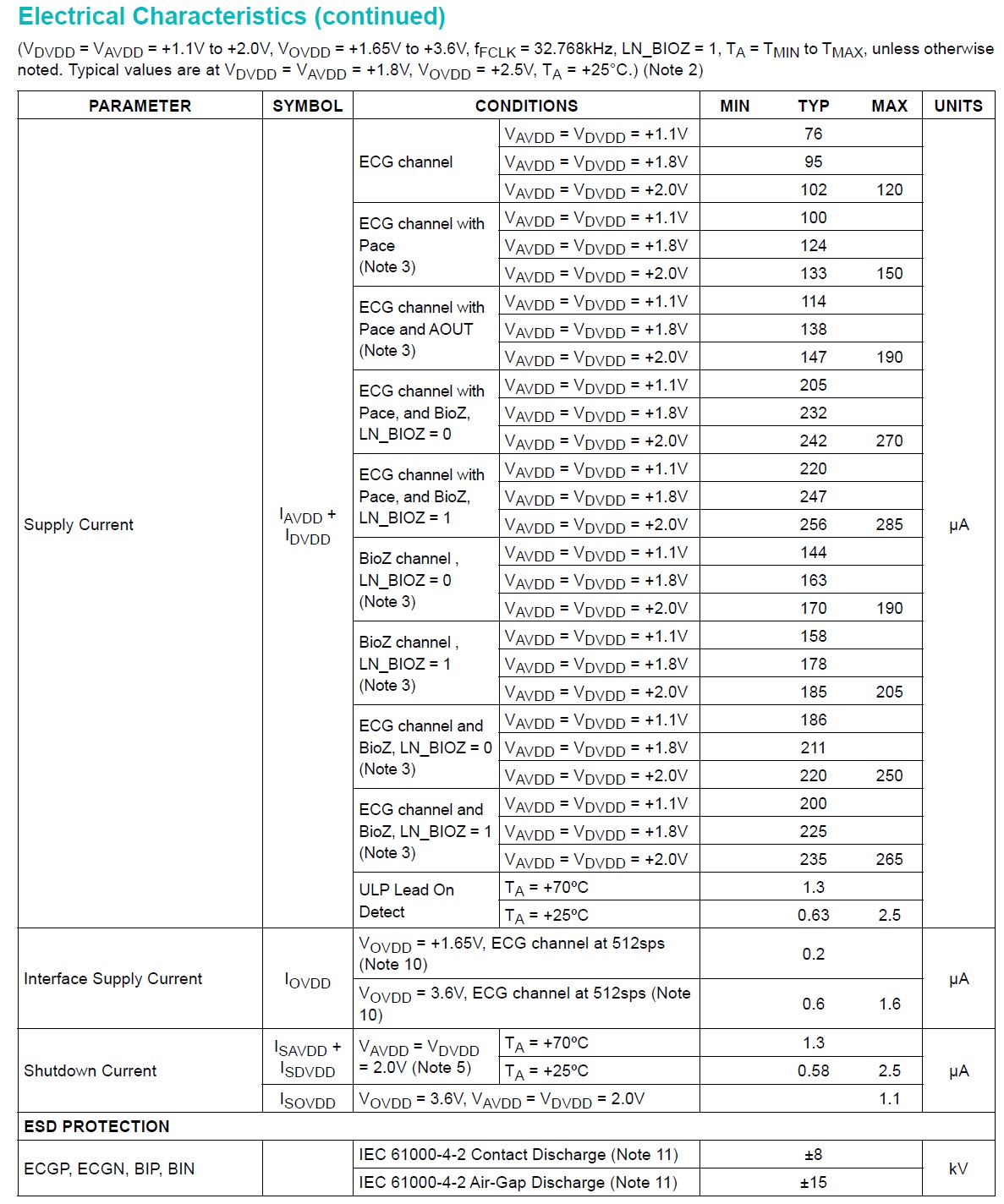 The MAX30001 is advertised as being an ultra-low-power device, and this indeed appears to be the case according to the Electrical Characteristics table given in the datasheet (see image below). The lowest operational current/power consumption occurs when voltages VAVDD and VDVDD are both connected to 1.1V and when only the ECG functionality is utilized. Under these conditions, a mere 76µA (or 83.6µW) is used. During non-operational conditions (i.e., shutdown mode), only 0.58µA (typical) is used when VAVDD and VDVDD are both connected to 2.0V.