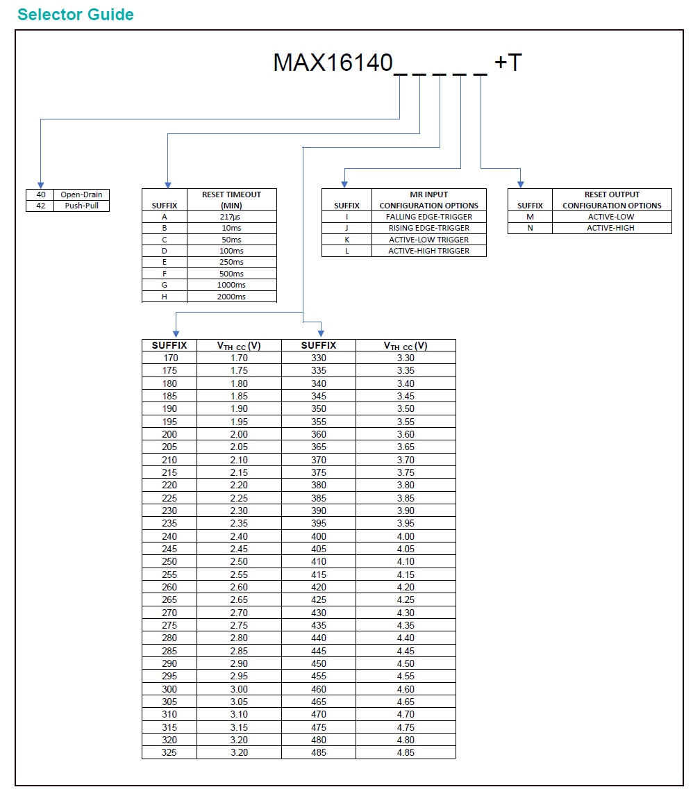 Although this voltage supervisor has a relatively wide operating voltage range, from 1.7V to 5.5V, this IC can’t monitor supply voltages up to 5.5V. Rather, it’s promoted as being able to monitor voltages ranging from 1.7V to 4.85V with very small, impressively small, increments of 50mV. The downside is that this device is not made for end-user customization; you must order the pre-programmed (i.e., factory-programmed) IC with your desired settings. And if you’re hoping to pinpoint the exact voltage threshold for your design through trial and error, then you would need to order a variety of different, pre-programmed, voltage threshold settings. Fortunately, Maxim has made this selection process easy via their Selector Guide (see image below).