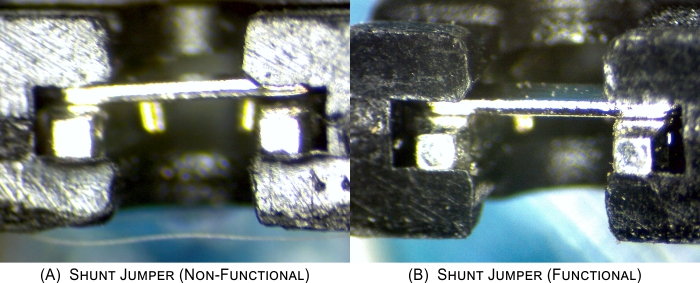 Figure 5. The image above shows a non-functioning shunt jumper on the left and a functioning shunt jumper on the right. Photo credit: Mark Hughes, AAC.