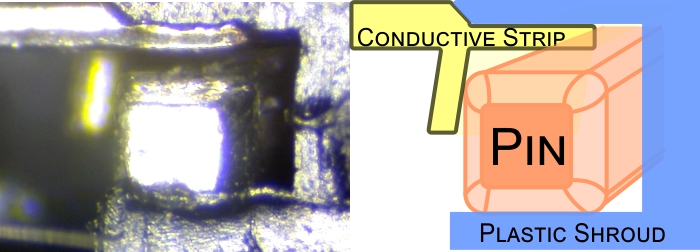 I resoldered the header pins to the board to eliminate the chance of a cold solder joint and grabbed another shunt jumper from the bag. Still no success. To the naked eye, and even under light magnification, it is impossible to tell that the jumpers are malformed. Only when they are installed and inspected at medium to high magnification, and at just the right angle, is the problem apparent.