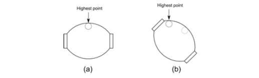 Figure 1 illustrates an exaggeration of the glass vial which highlights how it works. Figure 1(a) shows the bubble is centered when the vial is perfectly horizontal. In Figure 1(b), the bubble migrates to the highest point when the vial is rotated. Notice that the old position marked as the faded bubble has a lower height. Since the bubble is less dense, it always floats toward the top of the curved vial surface.