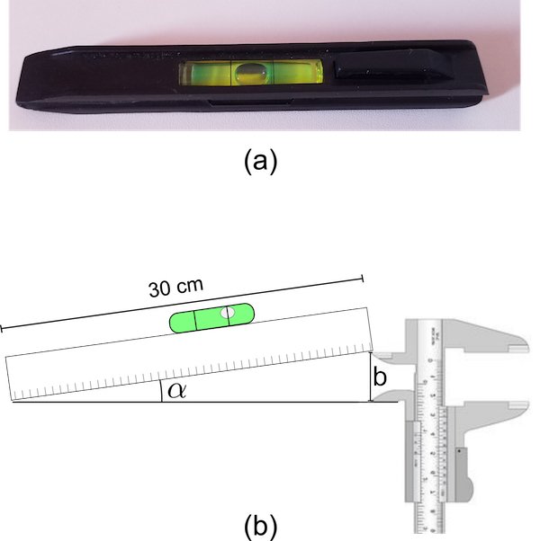 For the measurement, we used a 31cm long ruler and placed a general level over it. Figure 2(b), shows the ruler touching the surface at one end while raising the other. We used the caliper to measure the height at the raised side. The bubble rests in the middle of the vial when the ruler is parallel to a plane surface. In this case, the value of α is zero. Then, we raised one end of the ruler until it reached the first black mark and recorded the height, which is the variable ‘b’ denoted in Figure 2(b). The sensitivity is calculated using the following formula: