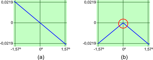 Leveling is a process where the user turns the device until α reads zero. We use a sound interface to indicate when this happens. Since the level is binary information (it is or it is not level), we establish that a sound signal below a maximum frequency is out of level. Thus, we must change the shape of the input signal to let us know when α=0° is read. This task is accomplished by using the absolute value function on Vy(α) for values of α in the green shaded region. The result is highlighted in Figure 7, where Figure 7(a) indicates the original signal and Figure 7(b) indicates the result of the absolute value function circuit. Notice the red circle indicating a point of maximum when α=0°. Then, the device is level when the user turns the device until it reaches highest pitch.